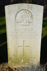 Private Appleyard was evacuated from the Gallipoli Peninsula to a hospital ship in September 1915. He appears to have been suffering from dysentery and rheumatic fever. He was in hospital in Malta before being transferred to England in October 1915. Hospitalisation and treatment continued right through to July 1916. He left England for the front in late July and rejoined his battalion on 8/8/16, nearly a year after being evacuated from Gallipoli. At Pozieres, and less than 2 weeks after rejoining his unit, he was wounded on 20/8/16, and then died from the wounds just 4 days later on 24/8/16, at the 44th Casualty Clearing Station. He was buried in a marked grave at Puchevillers British Cemetery.