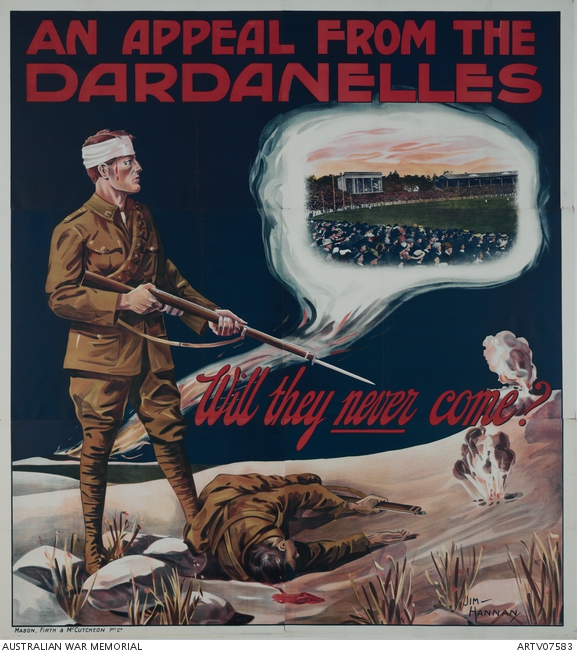 ARTV07583 ← Previous Next → July 1915 Recruiting Poster: “Will they never come?”, courtesy Australian War Memorial