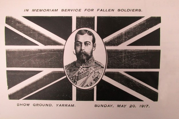 As indicated in the previous post, the major activity undertaken by the Yarram Recruiting Committee in the first half of 1917 was the memorial service held in Yarram on Sunday 20th May 1917. It was followed by a recruiting meeting or ‘demonstration’. The memorial service was staged at the showgrounds at 2.00 pm and the recruiting meeting was held that evening.