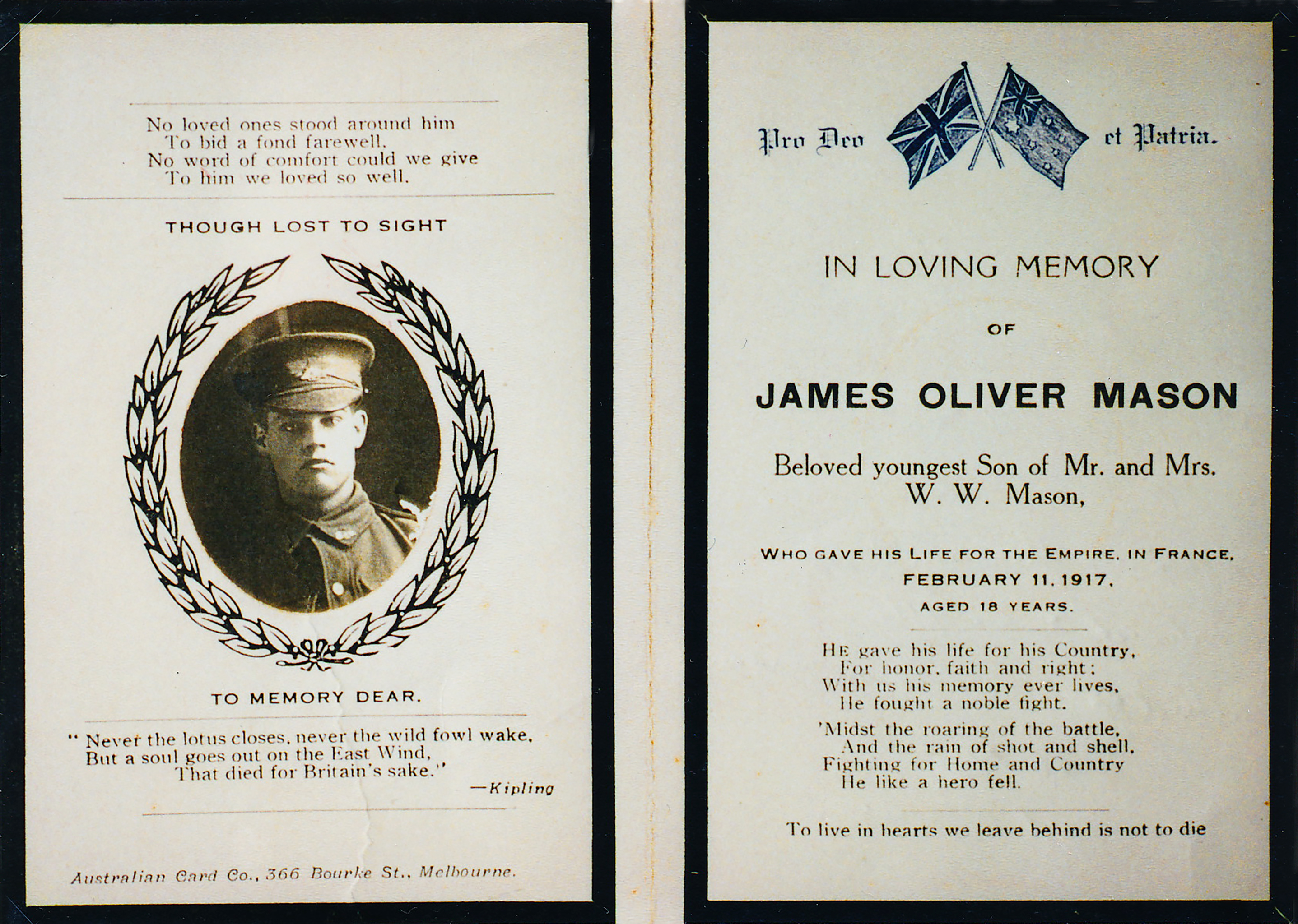 ed Mason mem card ← Previous Next → Memorial Card for J O Mason, courtesy Yarram & District Historical Society