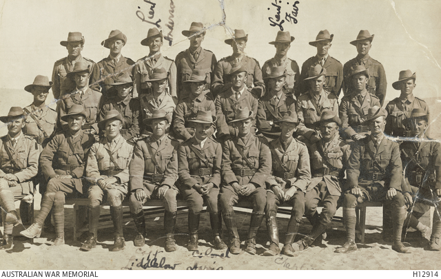 H12914 ← Previous Next → Officers 59 Btn. Egypt. Capt. Aubrey Liddelow fourth from left, front. Courtesy AWM.